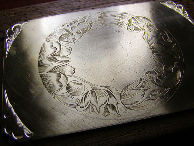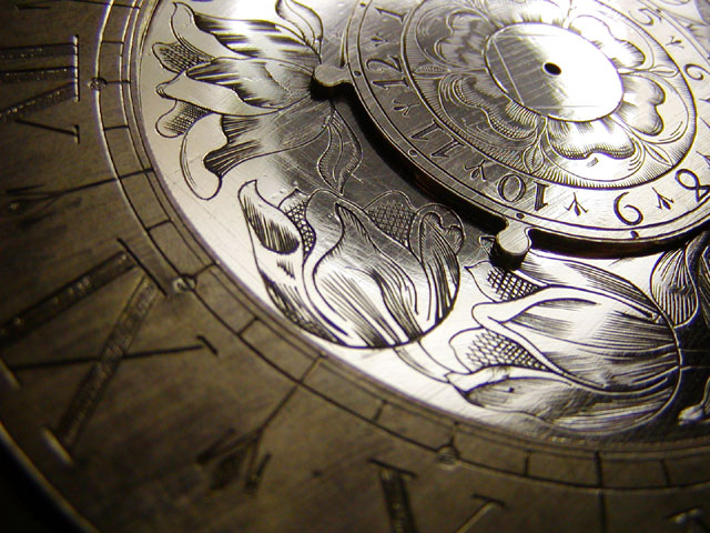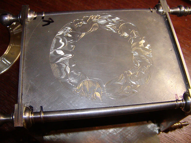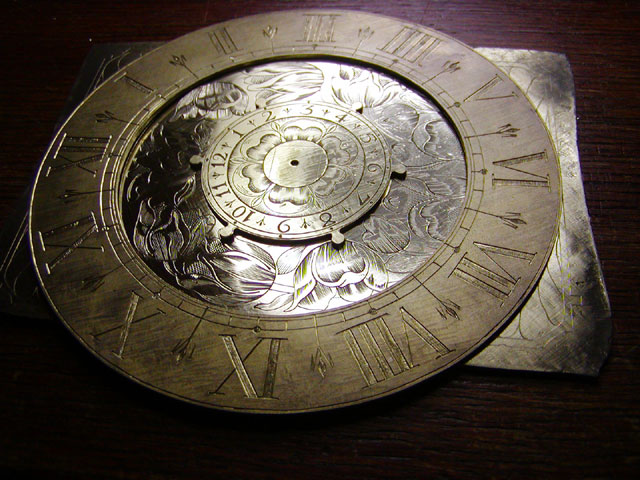 The plates had a nice texture after the scraping and I could engrave them right away. Although the whole clock was drawn on paper first and all the measurements were known, I decided to wait with cutting them in the right proportions. I needed a top and a bottom plate first.