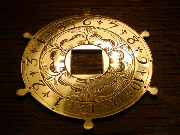 For my replica lantern clock I engraved this alarm disc, a fret, dial plate and chapter ring