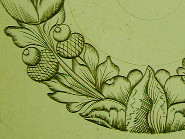 Practically all dial plates of lantern clocks have floral ornaments. About 1650 English engravers started to use the tulip as a new flower to decorate these dials. This is a copy of an early example of such engravings.