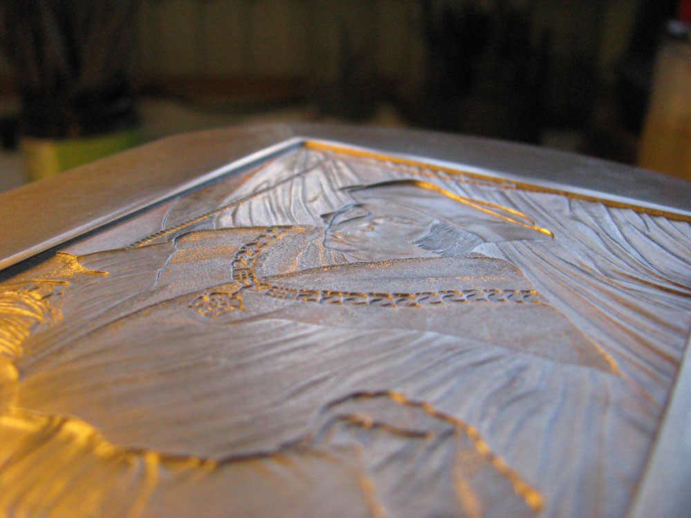 De stempel is in een vrij groot stuk gereedschapstaal gesneden. Op de bovenstaande foto lijkt het weer alsof de gravure als een bolling op de stempel ligt. Toch is dat niet zo. De stempel is inwaarts en dat is op de volgende foto goed te zien.