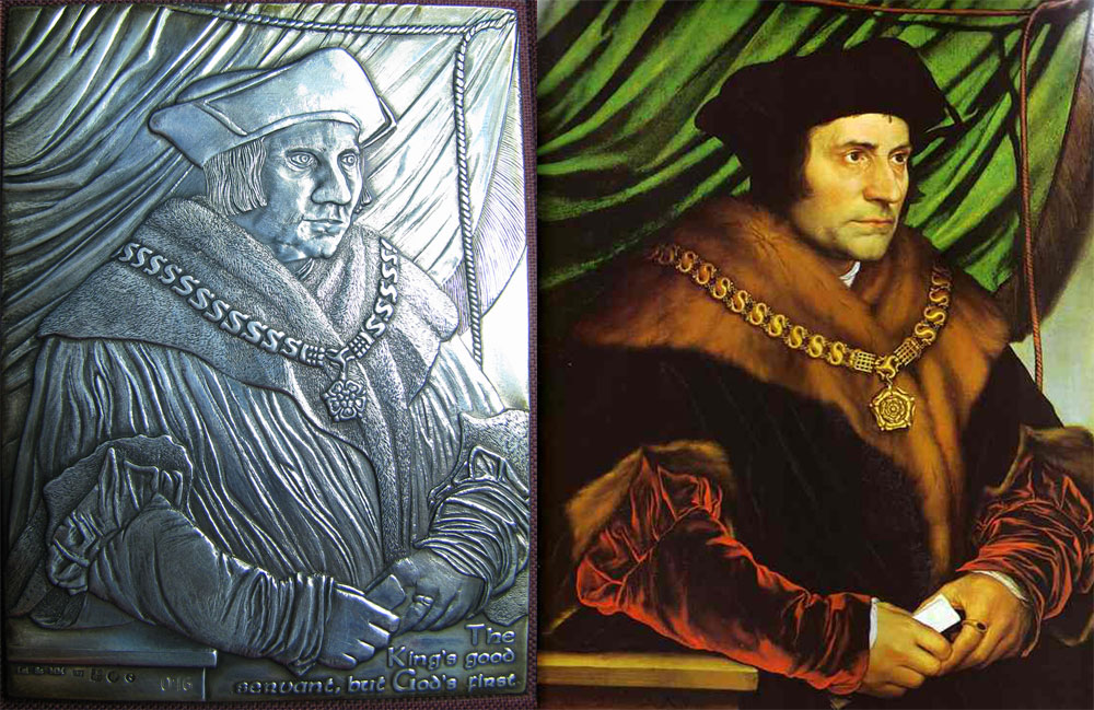Ter gelegenheid van het vijftig-jarig bestaan van de Studiekring Thomas More 's-Hertogenbosch kreeg ik de opdracht om een stempel te maken voor een zilveren plaquette die de voorkant van het herdenkingsboek moest sieren. De vrij grote plaquette van 80 x 60 mm. stelt een portret voor dat door Hans Holbein de Jongere in 1527 van sir Thomas was geschilderd.